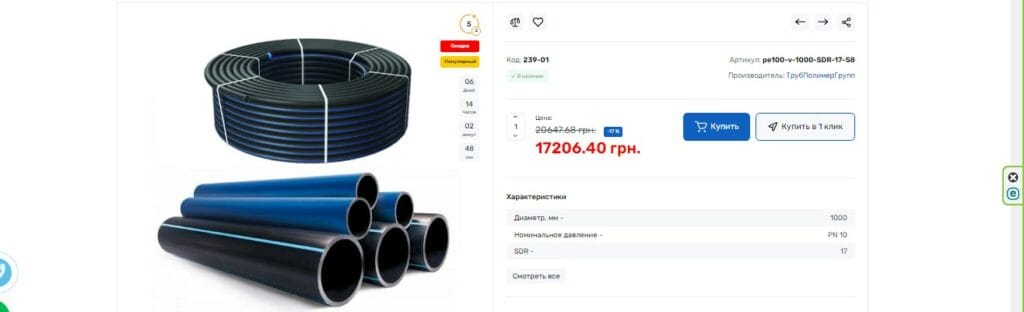 Труби поліетиленові ПЕ100 PN10 SDR17 d1000×59,3 — ціна відповідно до підсумкової відомості ресурсів (додаток 2, стор. 20, рядок 60) становить 34 тис. 568 грн без ПДВ, кількість 2238,92 м., загальна вартість в закупівлі склала 77 394 986,56 грн без ПДВ (77,3 млн грн).