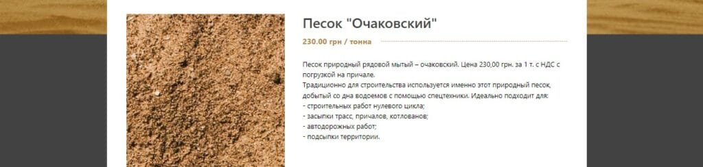 Пісок природній рядовий — ціна відповідно до підсумкової відомості ресурсів (додаток 2, стор. 20, рядок 62) — 1380 грн без ПДВ, кількість 12 300 м.куб., загальна вартість в закупівлі склала 16 974 000 грн без ПДВ (16,9 млн грн).